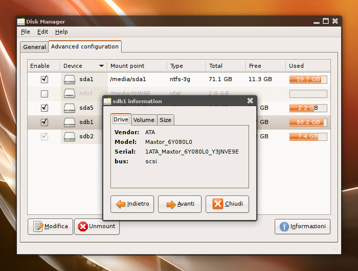 Quella che vi presento oggi è un'ottima interfaccia grafica (in gergo GUI) al file /etc/fstab, colui che regola quali partizioni sono montate all'avvio. Disk Managerpermette di gestire facilmente ogni partizione presente nel proprio sistema, scegliendo le varie opzioni di montaggio e facilitando l'abilitazione del driver ntfs-3g per tutte le partizioni formattate in NTFS. Consente inoltre di rilevare eventuali nuove partizioni o dischi all'avvio del sistema per configurarli in maniera ottimale.